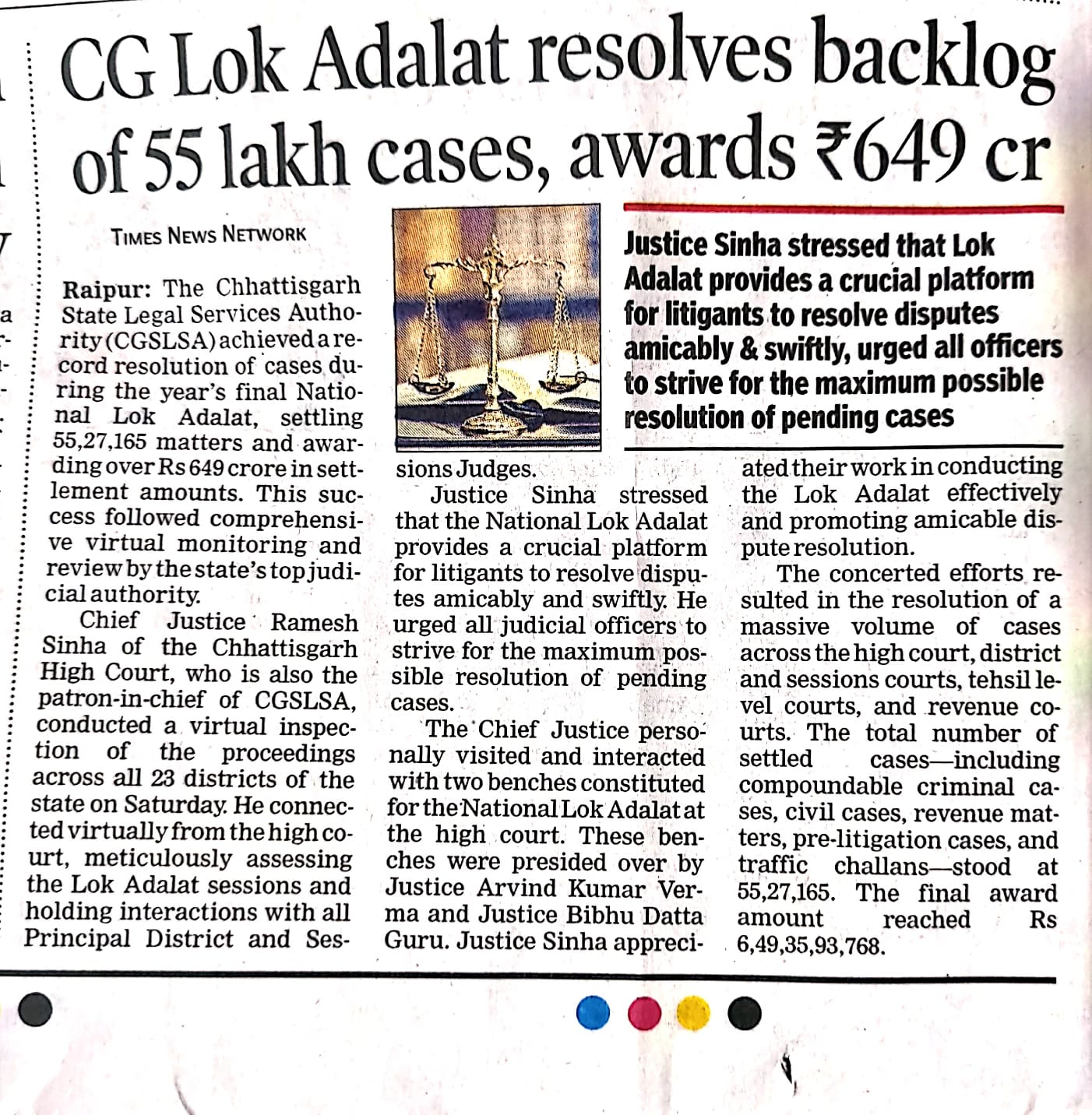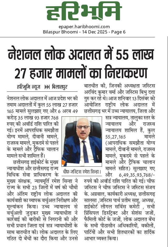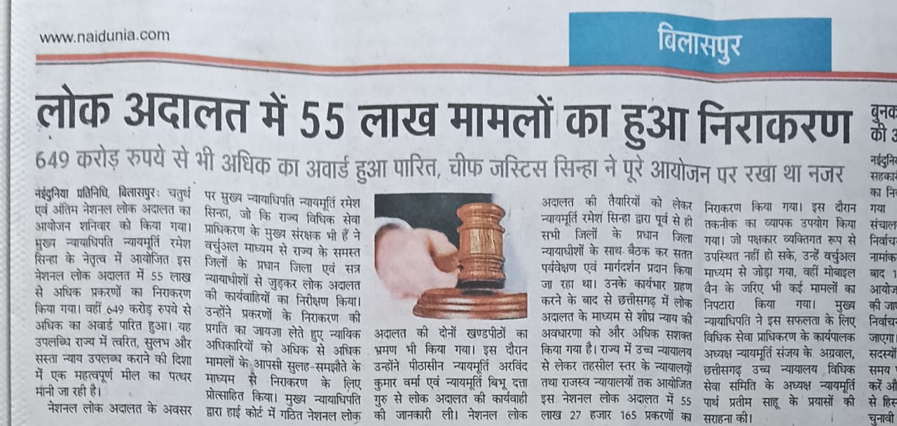 Times of India – CG Lok Adalat resolves backlog of 55 lakh cases, awards 649 cr.